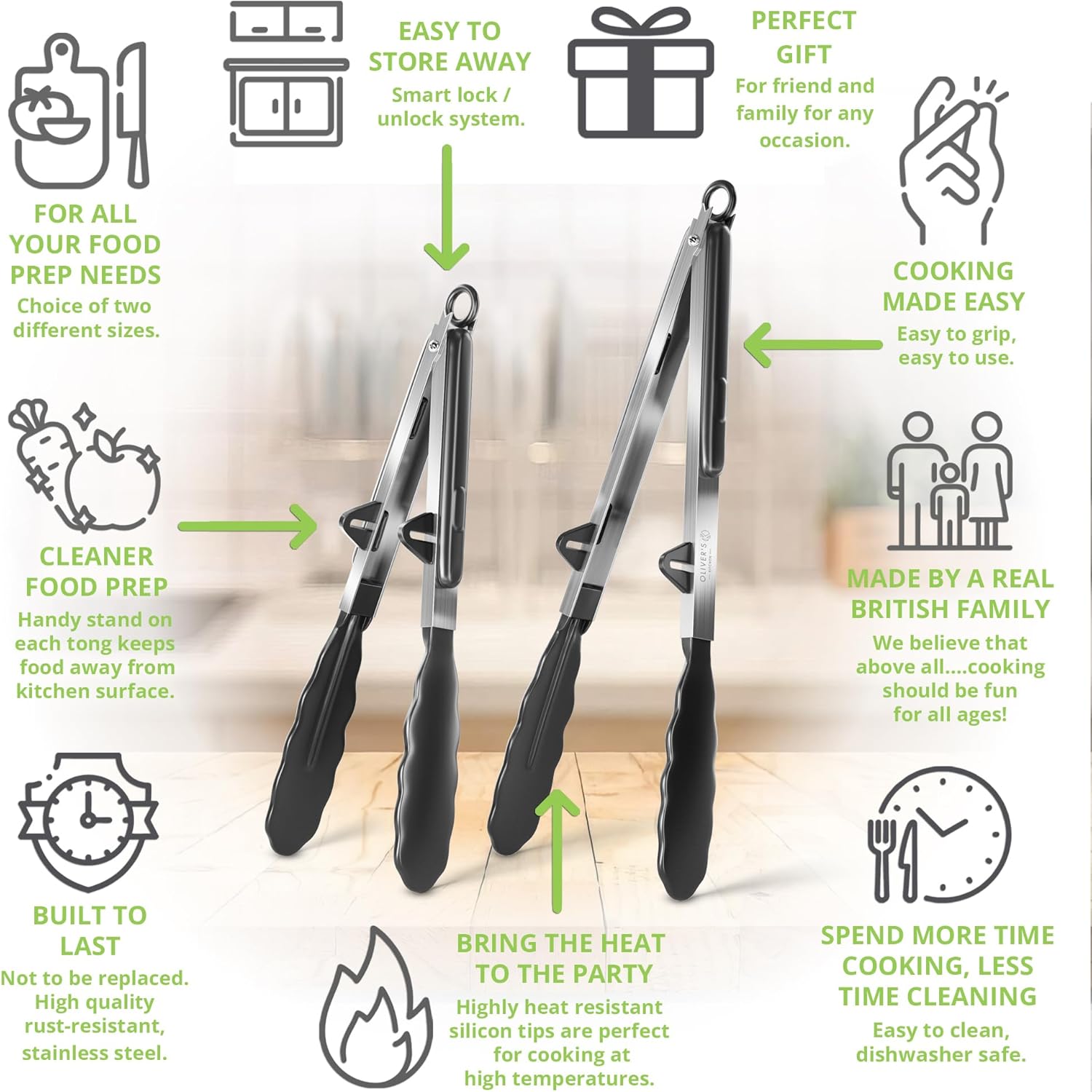 - Easy to grasp. EASY TO USE: Our cooking tongs are perfect for preparing a wide range of kitchens. With two different sizes of cooking tongs, whether you have a barbecue in the sun or cooking a stir-fry, our silicone tongs are suitable both as salad tongs and for serving main courses. The perfect gift for that friend who needs to ‘get a grip’